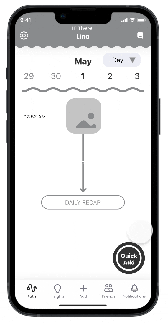 After considering users’ round 1 feedback, the biggest change implemented was incorporating the quick-add and habits function in a central add button as the main function of the app. In addition, we decided that a dialogue box would be helpful for first-time users to navigate through the distinction between a regular and quick-add.